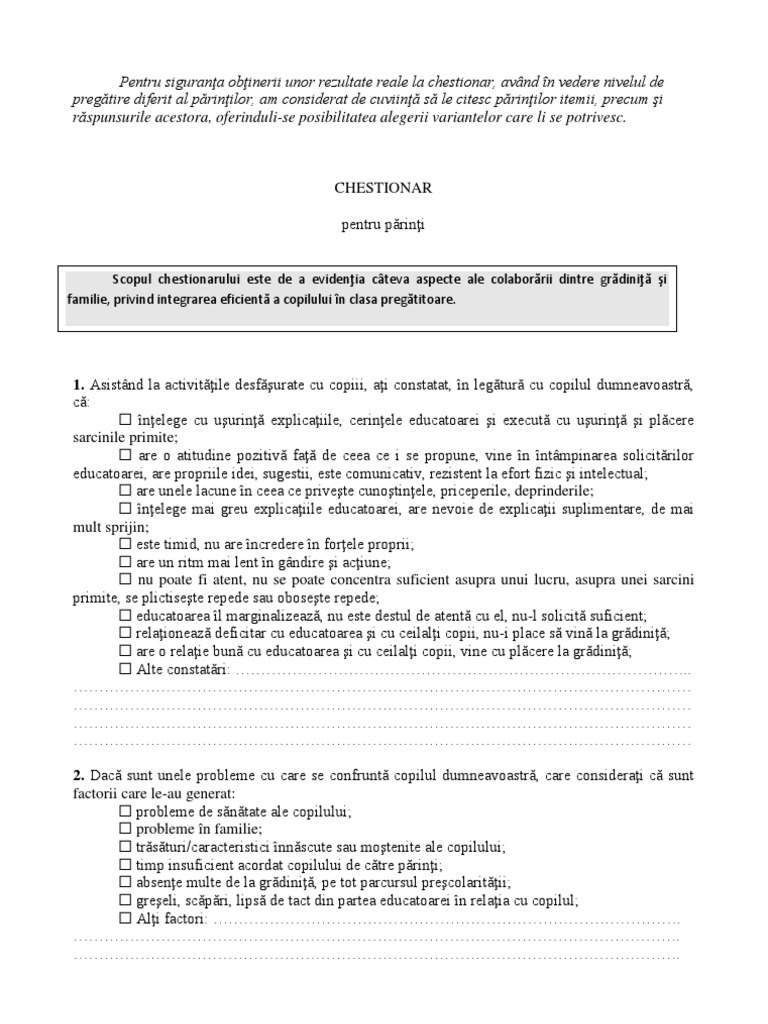 Doc Chestionar Pentru Părinţi Implicarea Familiei In Educaţia Copilului Lucru Manual Daniela Cernei Academia Edu